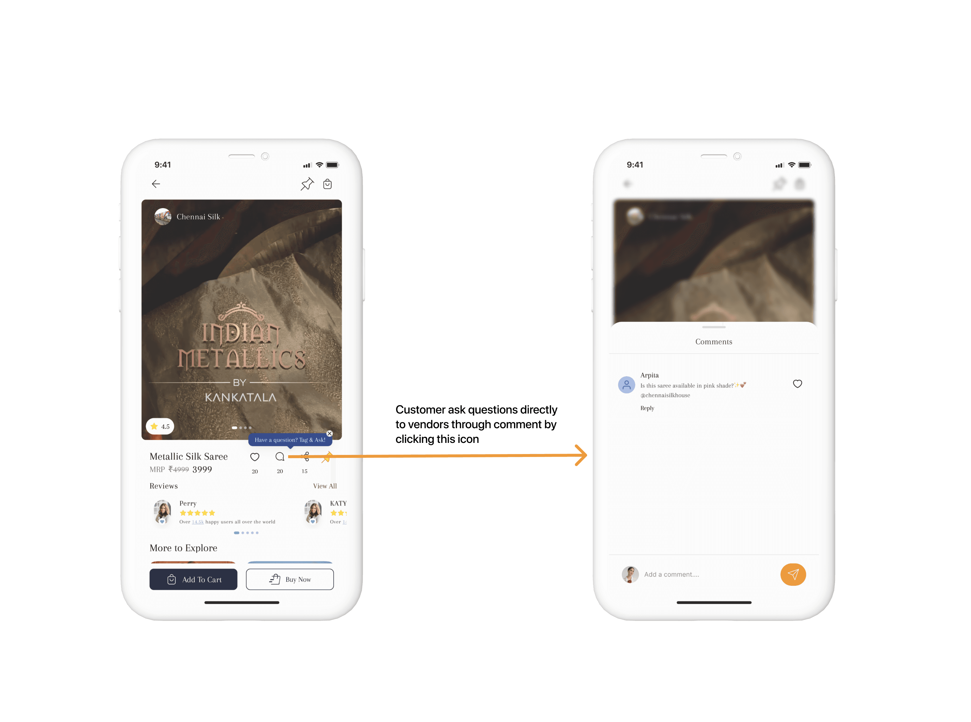 We made saree shopping feel social and trustworthy by enabling direct user–vendor conversations through comments while keeping reviews authentic and clutter-free.