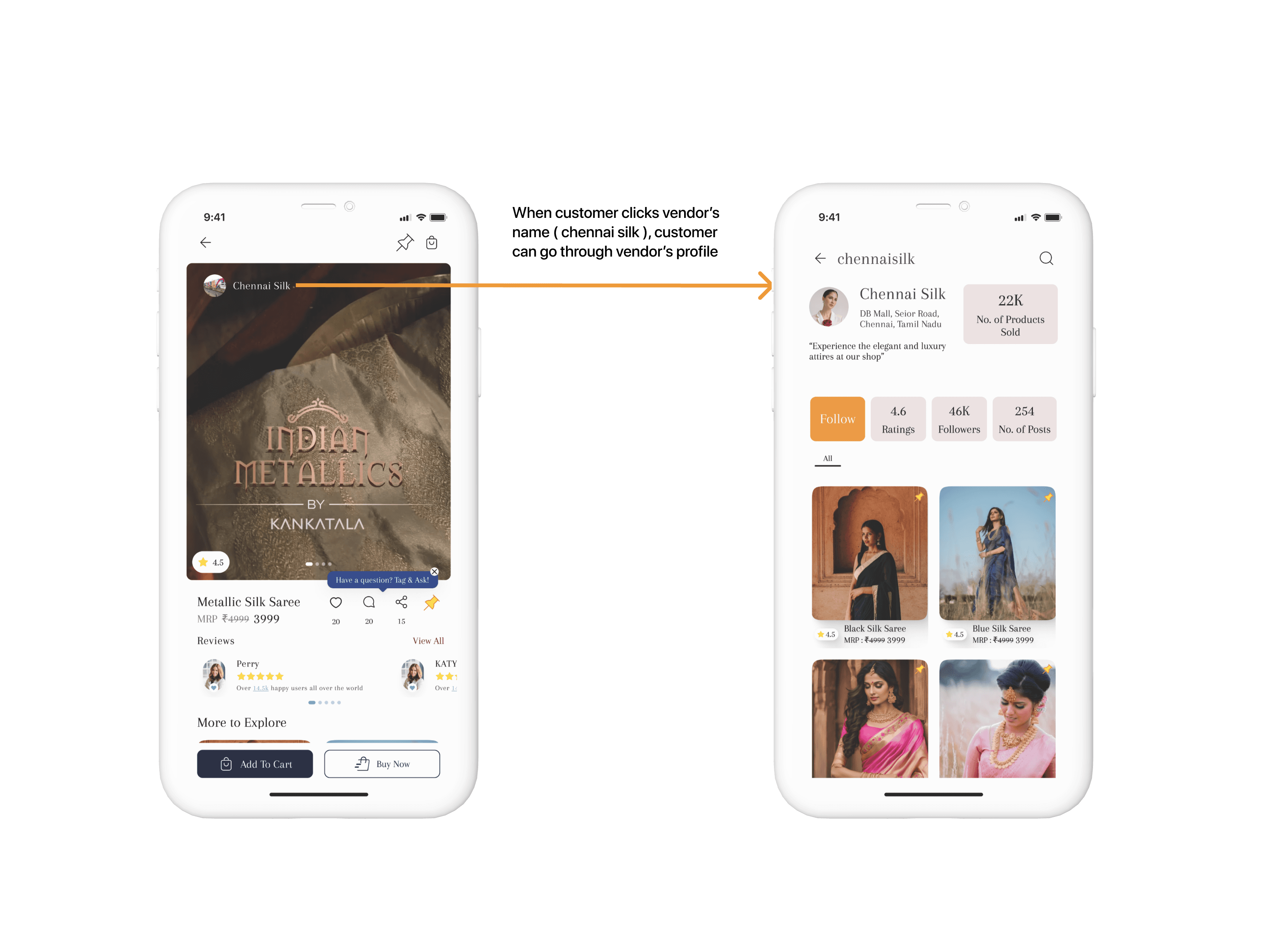 Users could view verified vendor profiles with their past posts, follower count, ratings, and the number of products sold, helping them judge credibility and buy sarees with confidence from certified sellers.