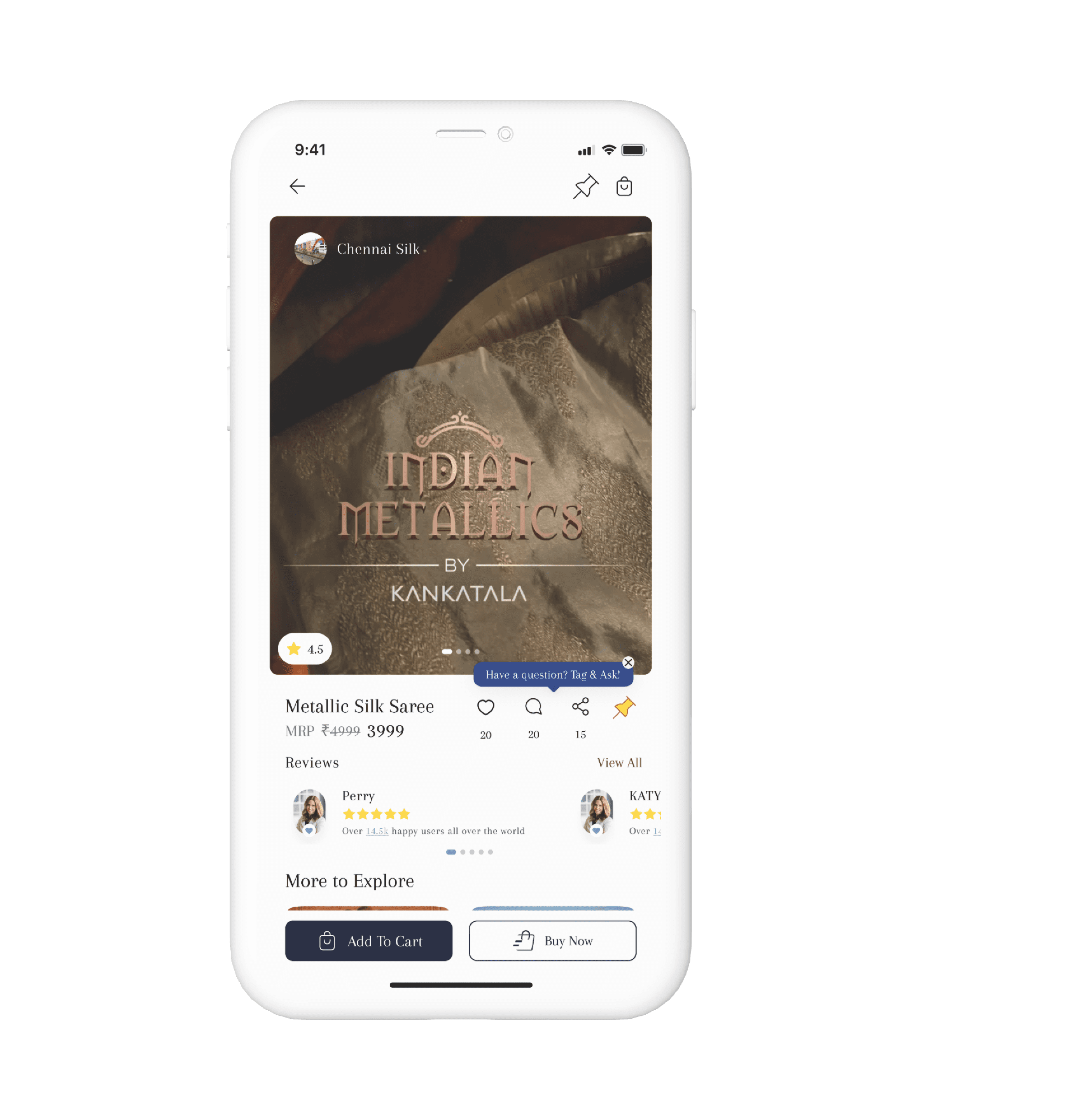 We designed this screen to feel like browsing a trusted seller on social media, but with the safety of a marketplace. Customers can explore the saree, see what others love, ask questions, and buy with confidence; all in one place.